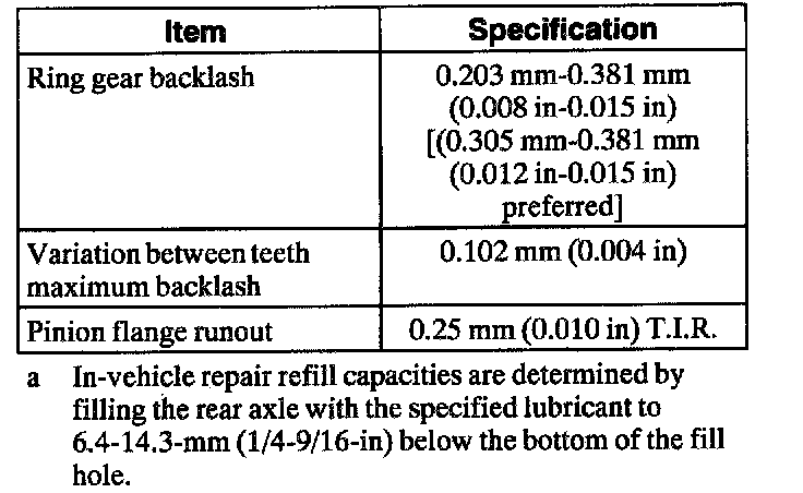 b In-vehicle repair refill capacities are determined by filling the rear axle with the specified lubricant to 6.4-14.3-mm. (1/4-9/16-in) below the bottom of the fill hole.