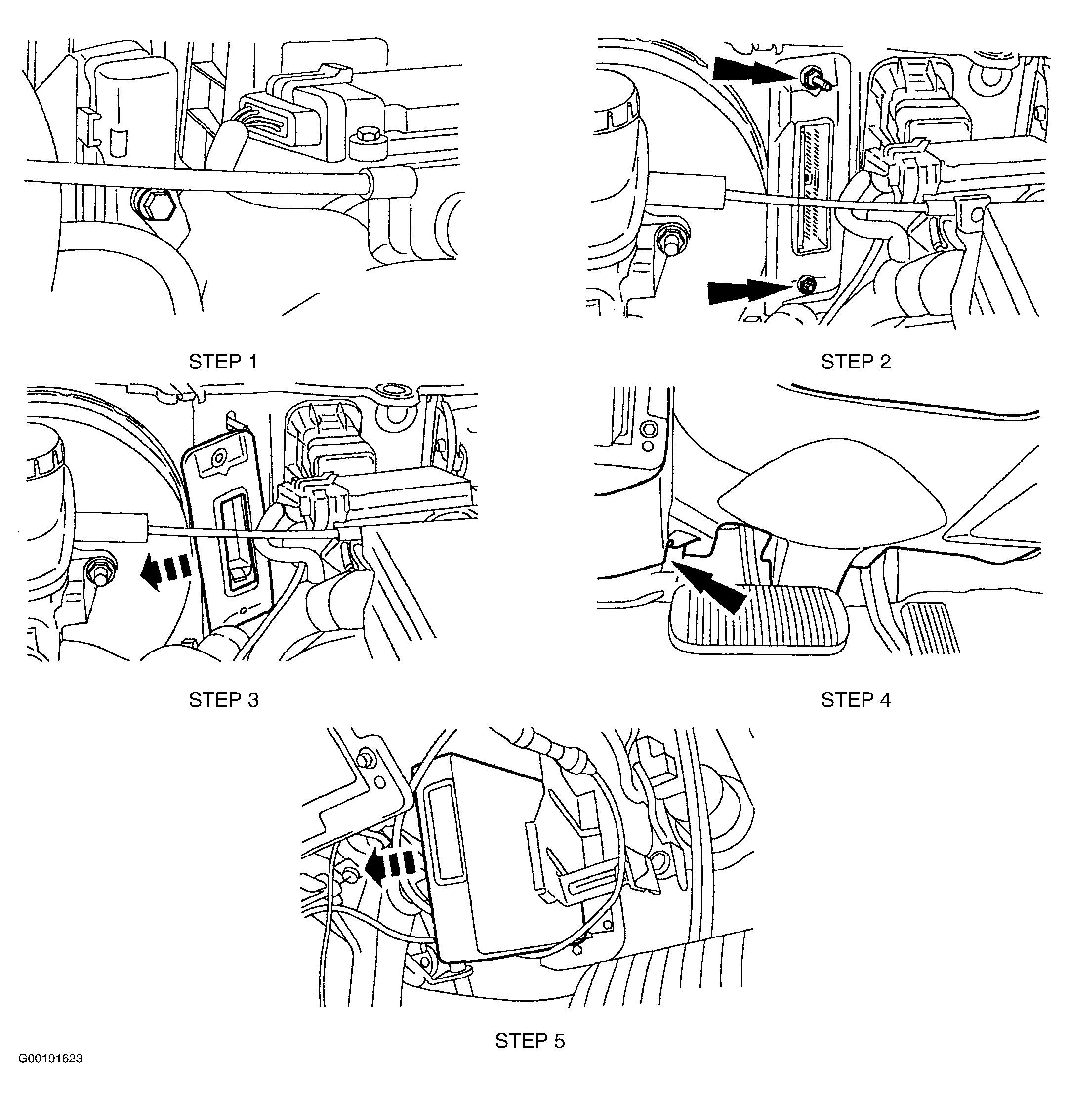 Disconnect negative battery cable. Loosen Powertrain Control Module (PCM) harness connector retaining bolt, and unplug PCM harness connector. See STEP 1 in Fig 1. Remove 2 PCM cover nuts. See STEP 2 in Fig 1. Remove PCM cover. See STEP 3 in Fig 1. Remove driver's side under-dash lower cover. See STEP 4 in Fig 1. Remove PCM from under instrument panel. See STEP 5 in Fig 1. To install, reverse removal procedure.