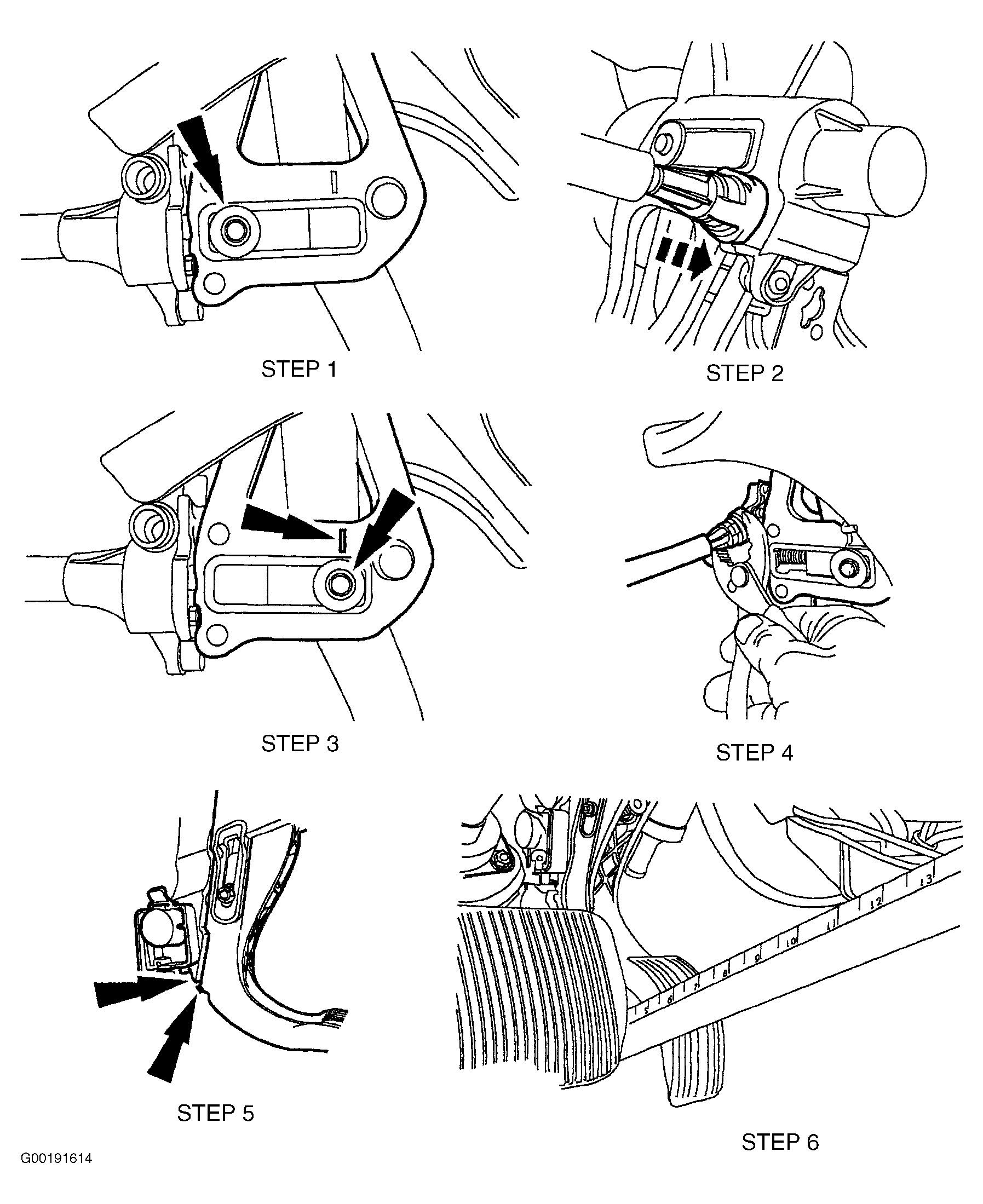 Connect pedal motor harness connector. Operate switch until accelerator pedal is at top of travel. See STEP 1 in Fig 1. Connect drive cable to brake pedal assembly. See STEP 2 in Fig 1. Operate switch until brake pedal is at bottom of travel (index mark). See STEP 3 in Fig 1. Disconnect drive cable at brake pedal assembly. See STEP 4 in Fig 1. Operate switch until accelerator pedal is at bottom of travel (index mark). See STEP 5 in Fig 1. Connect drive cable to brake pedal assembly. See STEP 2 in Fig 1. Check pedal adjustment travel, pedals should move at least 2" (50 mm). See STEP 6 in Fig 1. If pedals move as specified, indexing is complete.
