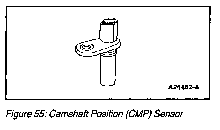 The camshaft position sensor (Figure 55) used by COP Integrated EI system is a magnetic transducer mounted on the engine front cover adjacent to the camshaft. By monitoring a target on the camshaft sprocket, the CMP sensor identifies cylinder one to the PCM. The COP Integrated EI system uses this information to synchronize the firing of the individual coils.