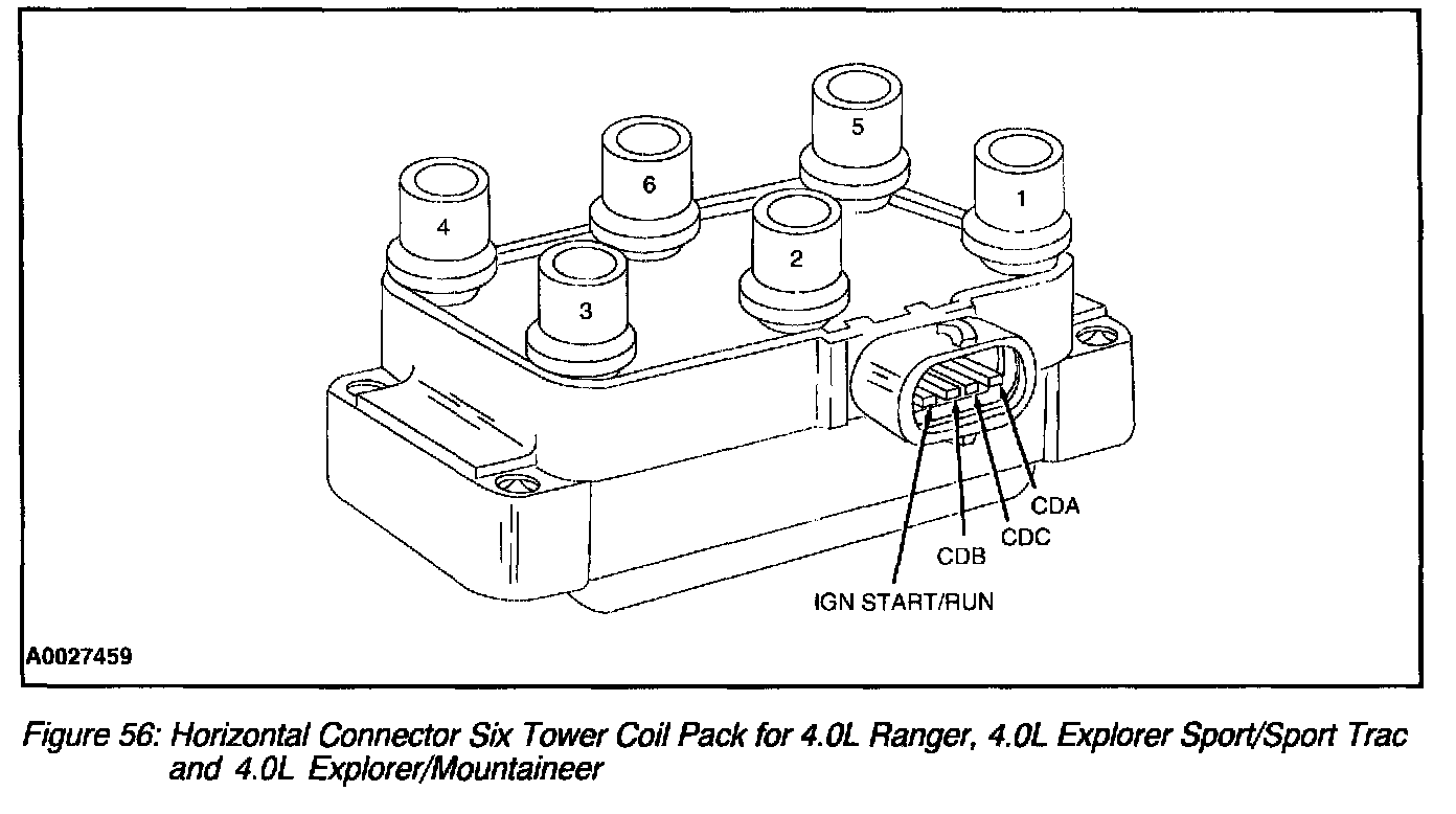 Coil packs come in four tower, Series 5 four tower, six-tower horizontal connector and Series 5 Six tower models. Two adjacent coil towers share a common coil and are called a matched pair. For six-tower coil pack (six cylinder) applications the matched pairs are 1 and 5, 2 and 6, and 3 and 4 (Figure 56)and (Figure 57). For four-tower coil pack (four cylinder) applications the matched pairs are 1 and 4, and 2 and 3 (Figure 58) and (Figure 59).