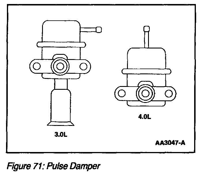 The fuel rail pulse damper (Figure 71) located on the fuel rail reduces fuel system noise caused by the pulsing of the fuel injectors. The vacuum port located on the damper is connected to manifold vacuum to avoid fuel spillage in the event the pulse damper diaphragm were to rupture. (The pulse damper should not be confused with a fuel pressure regulator, it does not regulate fuel rail pressure.)