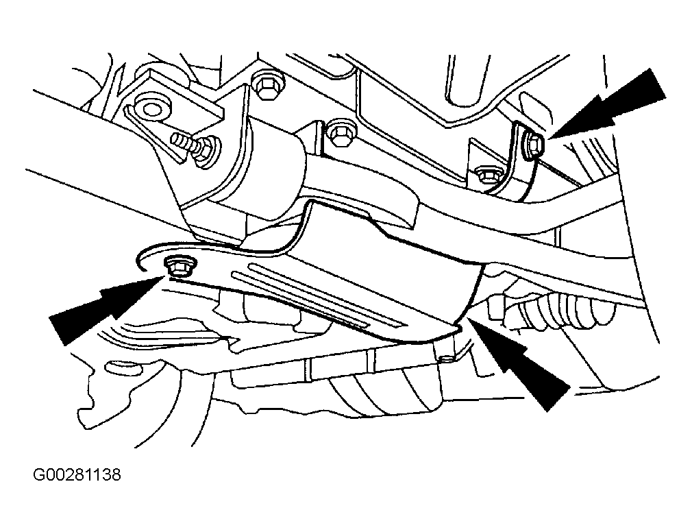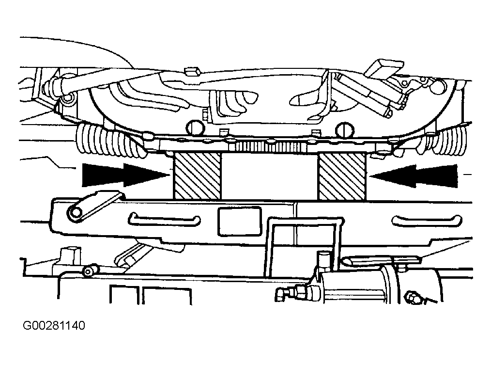 2. Position two 4 x 4 in. pieces of wood between the No. 2 crossmember and the lifting device. See Fig 3 . Raise and support the front end. Remove and discard the front lower control arm nut and bolt.