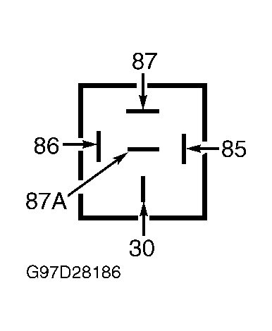 2. Using a jumper wire, apply battery voltage to relay terminal No. 85. Using a second jumper wire, ground relay terminal No. 86. Continuity should now exist between relay terminals No. 30 and 87. If continuity is not as specified, replace relay. If continuity is as specified, relay is okay at this time.