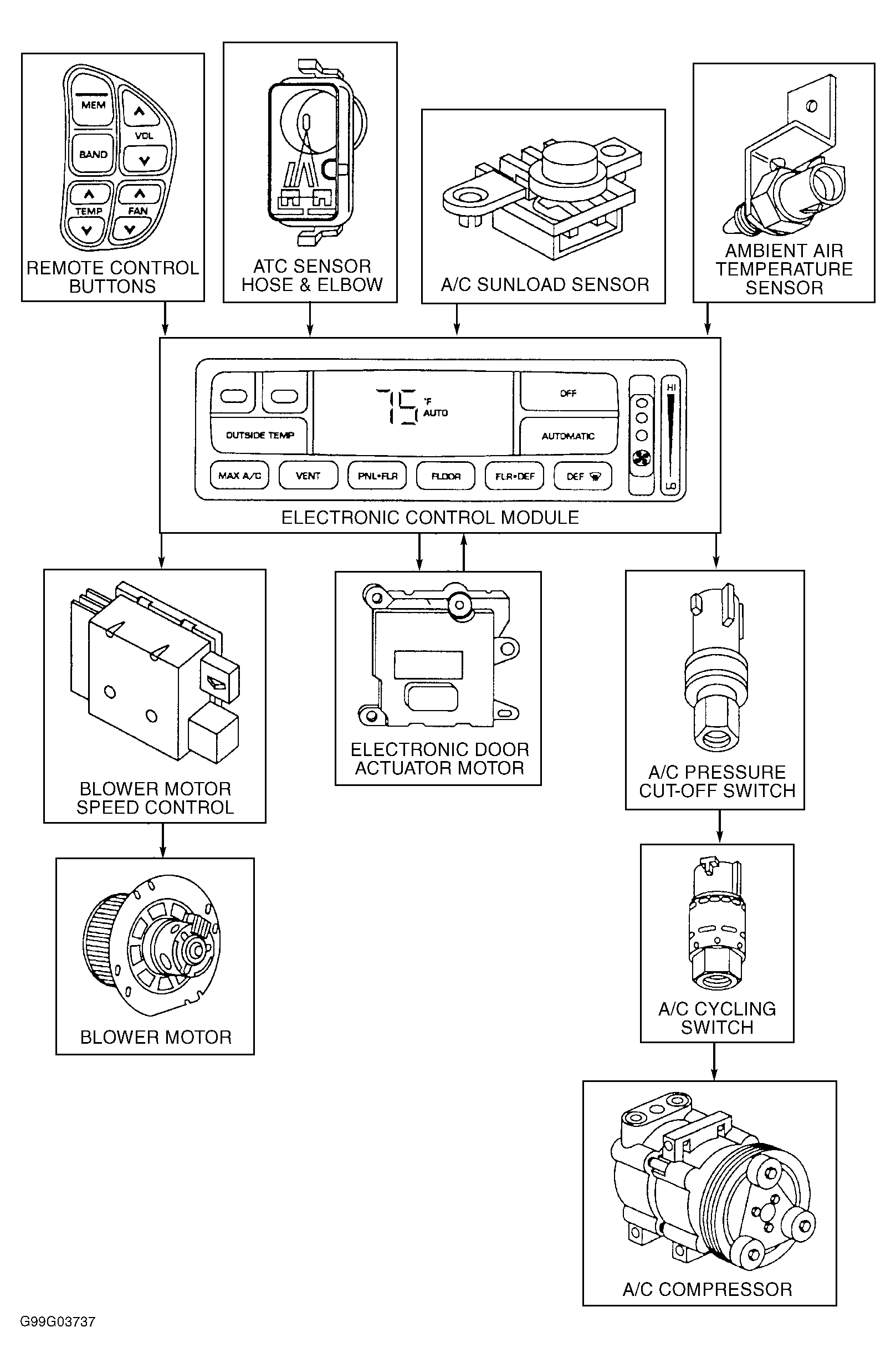 Automatic A/C-heater system is controlled through an Electronic Automatic Temperature Control (EATC) module and a series of sensors which measure ambient and interior temperatures, sunlight load, and other conditions, and automatically adjusts temperature operations to maintain a preset driver-selected temperature. See Fig 1. A/C-heater operations can be manually controlled, if needed, by choosing other control panel settings.