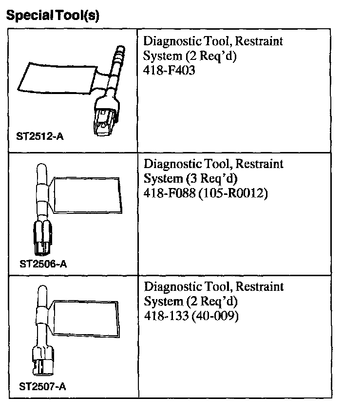 WARNING: THE RESTRAINT SYSTEM DIAGNOSTIC TOOL IS FOR RESTRAINT SYSTEM SERVICE ONLY. REMOVE FROM THE VEHICLE PRIOR TO ROAD USE. FAILURE TO REMOVE COULD RESULT IN INJURY AND POSSIBLE VIOLATION OF VEHICLE SAFETY STANDARDS.