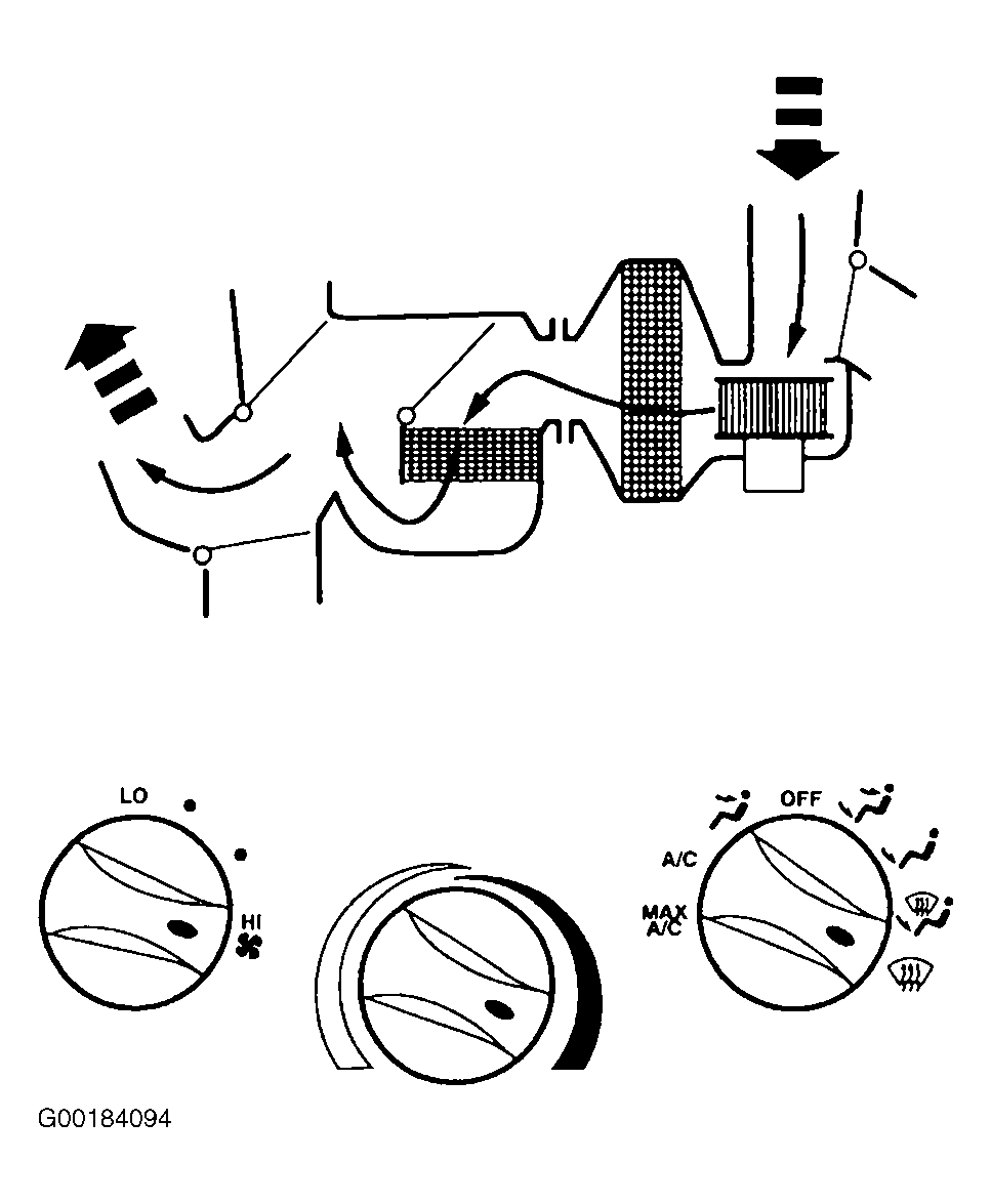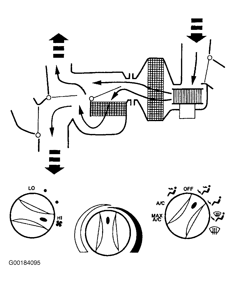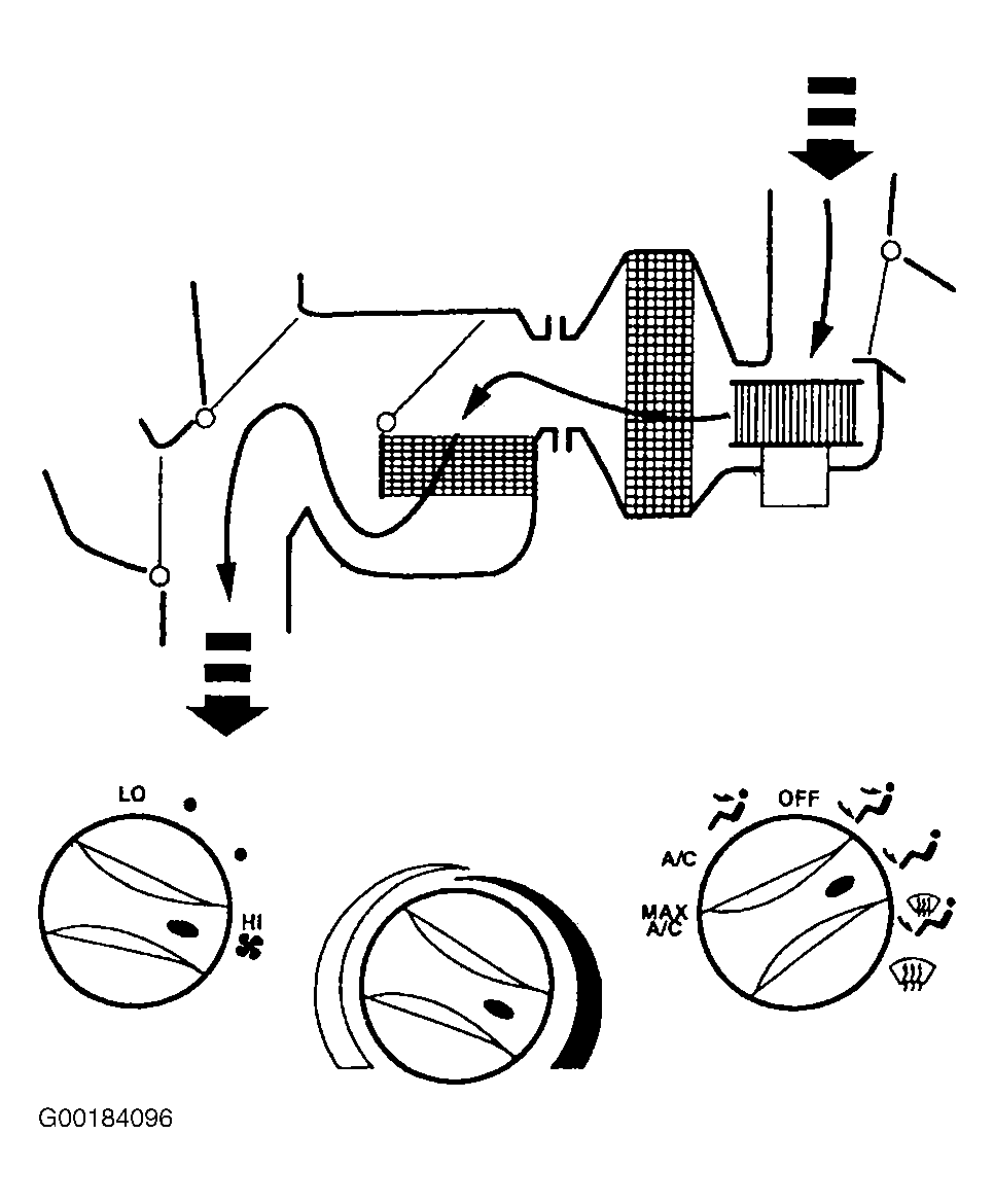 When function control switch is in MAX A/C position, air inlet door vacuum control motor is at full vacuum, closing off outside air and admitting only recirculated air. See Fig 1. Floor/defrost door and panel/floor door vacuum control motors are at full vacuum, directing airflow to instrument panel A/C registers. Blended air temperature is available. A/C compressor will operate if outside temperature is above approximately 43°F (6°C). Blower motor is on.