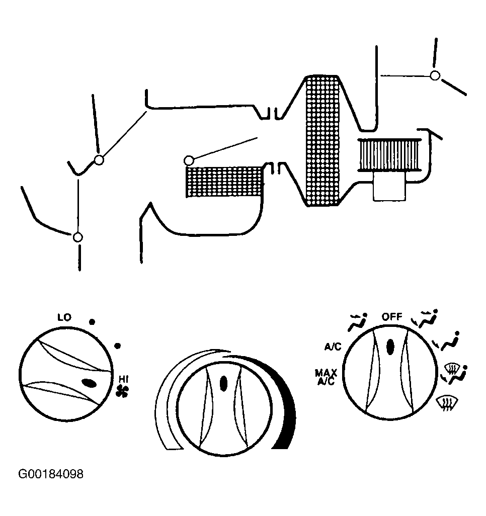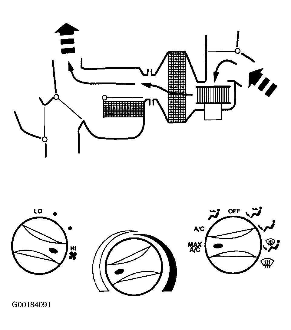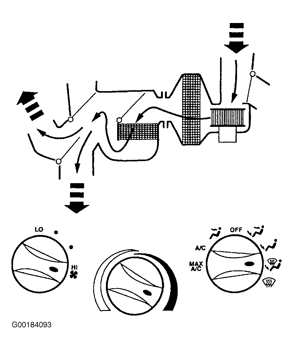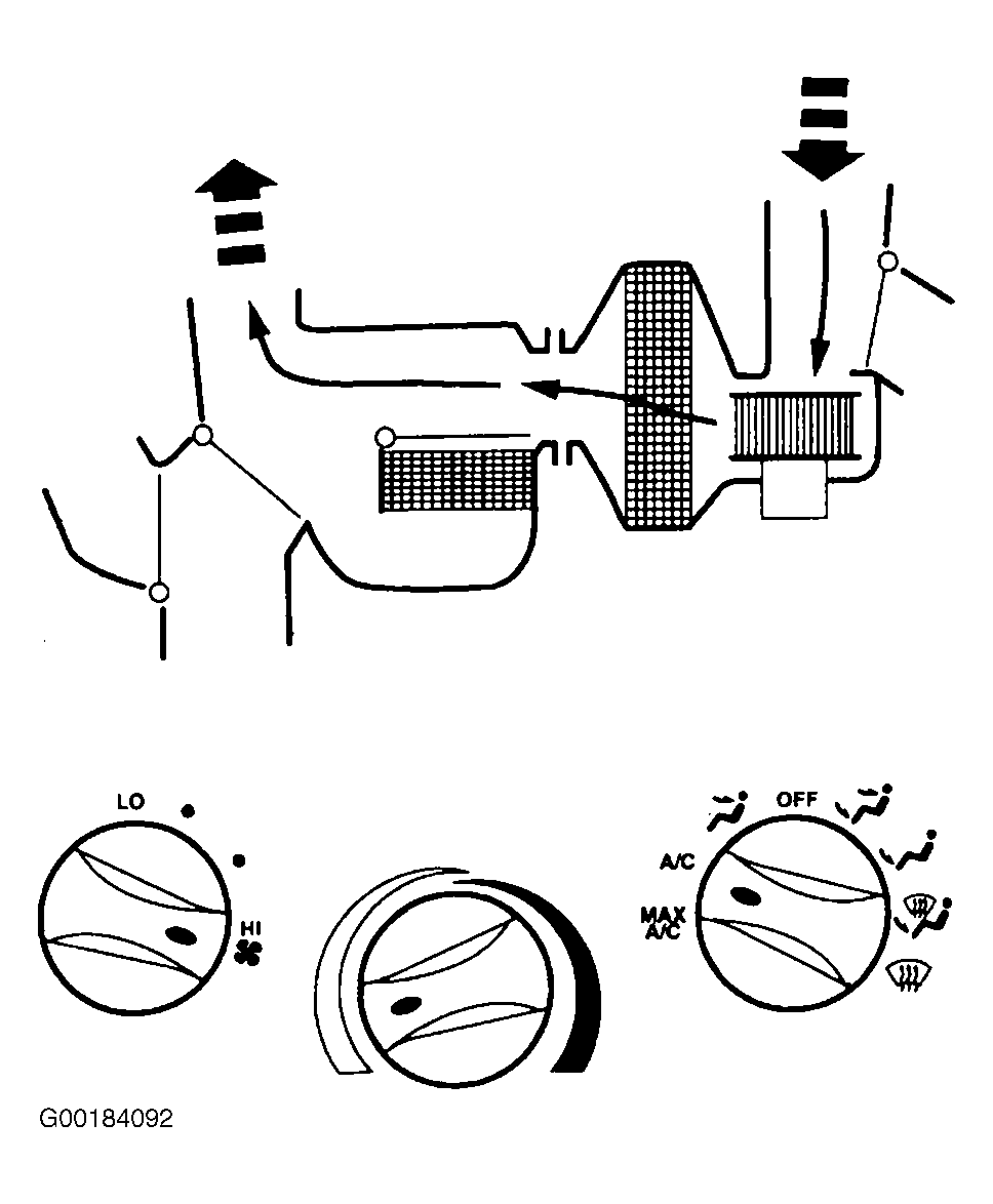 When function control switch is in MAX A/C position, air inlet door vacuum control motor is at full vacuum, closing off outside air and admitting only recirculated air. See Fig 1. Floor/defrost door and panel/floor door vacuum control motors are at full vacuum, directing airflow to instrument panel A/C registers. Blended air temperature is available. A/C compressor will operate if outside temperature is above approximately 43°F (6°C). Blower motor is on.