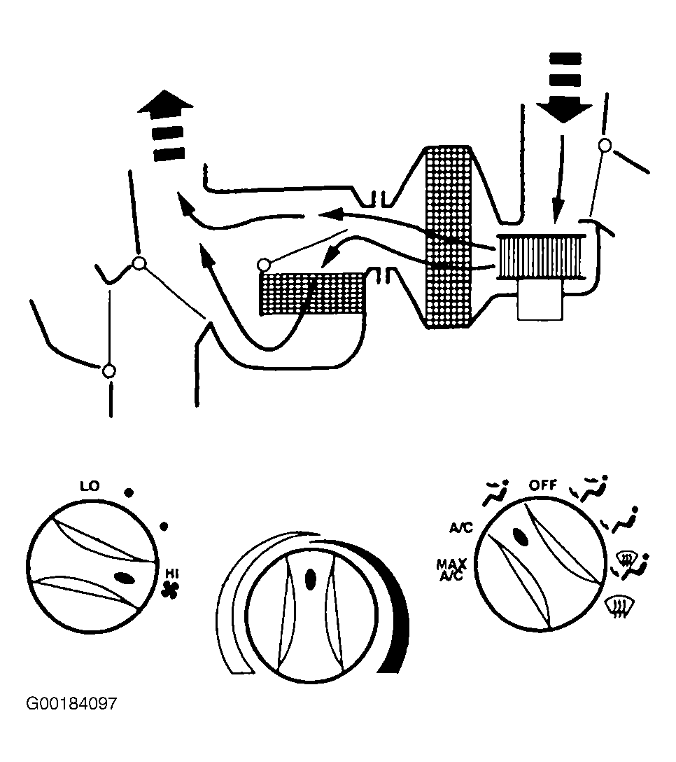 When function control switch is in OFF position, air inlet door vacuum control motor is at full vacuum, closing off outside air from entering passenger compartment. See Fig 4. Floor/defrost door vacuum control motor is at full vacuum and panel/floor door vacuum control motor is at no vacuum, closing off airflow to defrost duct, side window demisters, floor duct and instrument panel A/C registers. A/C compressor will not operate. Blower motor is off.