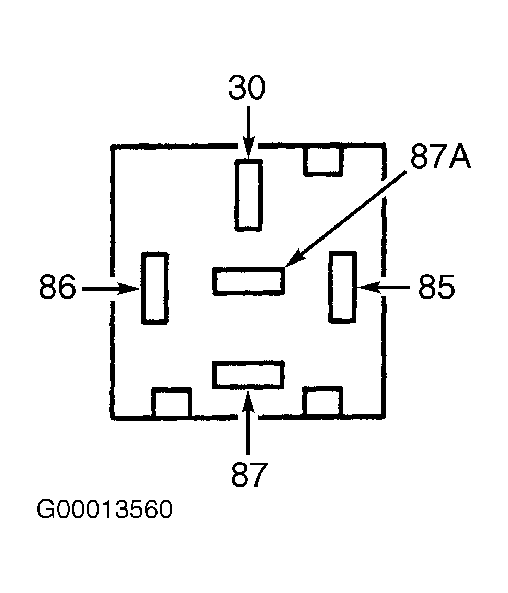 2. Using jumper wires, apply battery voltage to relay terminal No. 86 and ground relay terminal No. 85. Continuity should now exist between terminals No. 30 and 87. If continuity is not as specified, replace relay.