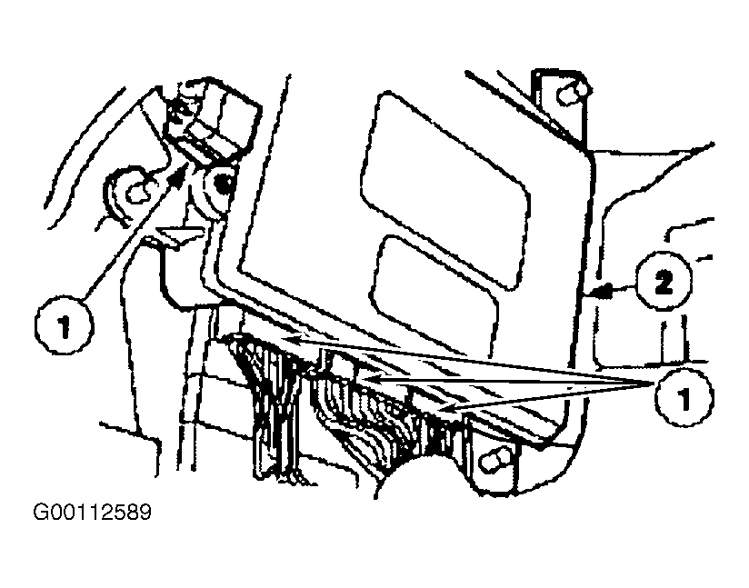 3. Position interior Auxiliary Junction Box (AJB) aside. Remove the nuts (1) and position the AJB aside (2). See Fig 1. Remove the nuts, bolt and position the Front End Module (FEM) aside.