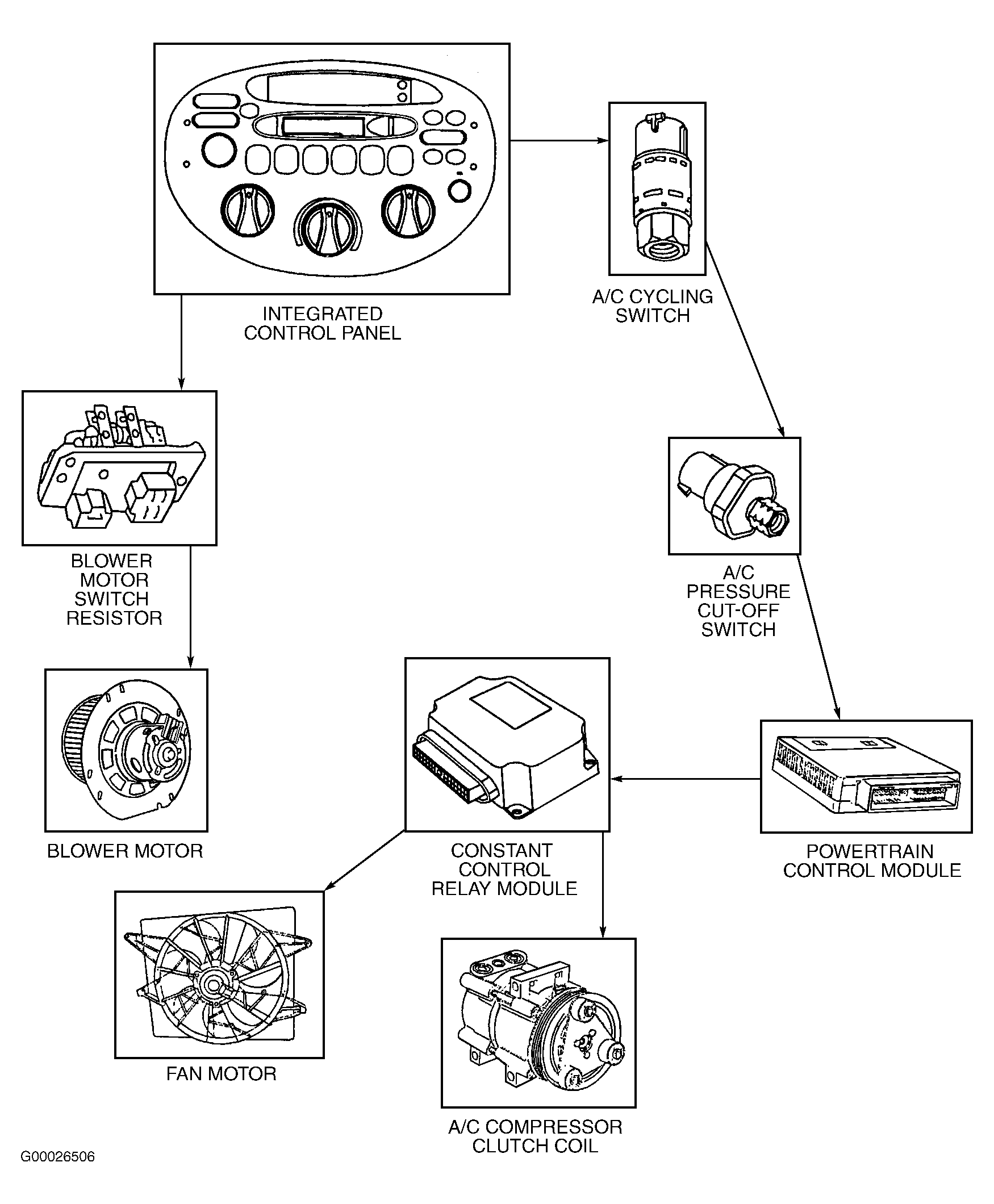 Constant Control Relay Module (CCRM), located on left side of engine compartment, is a solid-state electronic unit using a combination of relays and solid state switched to control operation of A/C compressor clutch, cooling fan, fuel pump and Powertrain Control Module (PCM). See Figure. PCM can interrupt A/C compressor operation through CCRM during engine start-up, Wide Open Throttle (WOT), low engine idle conditions or excessively high temperatures. For additional CCRM information and testing, see appropriate ELECTRIC COOLING FANS article in ENGINES.