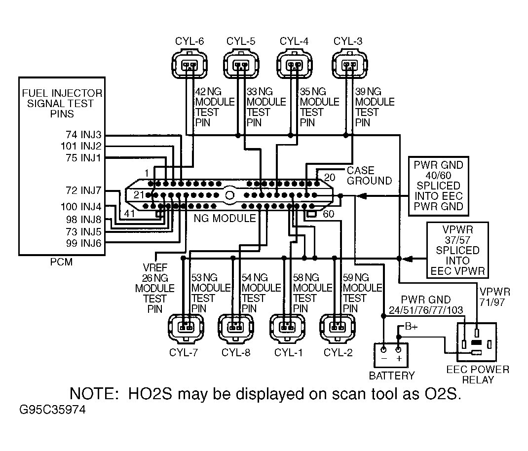 Turn ignition off. Disconnect Natural Gas Vehicle Module (NGVM) 60-pin connector. See NGVM LOCATION table. Using DVOM, check continuity between chassis ground and NGVM connector terminals No. 40 and 60. See Fig 1. If continuity exists, see POWER CIRCUITS . If continuity does not exist, repair open in affected ground circuit. See ENGINE PERFORMANCE in SYSTEM WIRING DIAGRAMS article in ELECTRICAL.