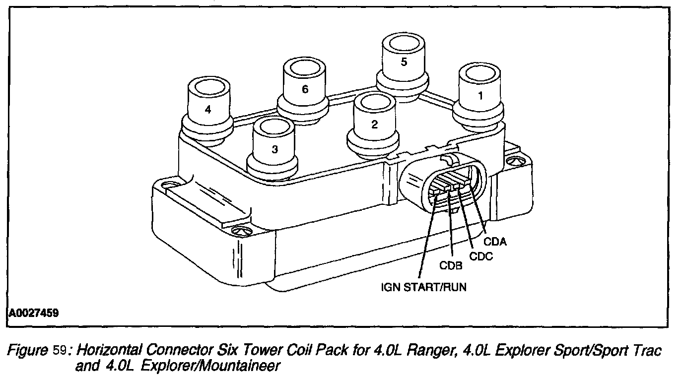 Coil packs come in four tower, Series 5 four tower, six-tower horizontal connector and Series 5 Six tower models. Two adjacent coil towers share a common coil and are called a matched pair. For six-tower coil pack (six cylinder) applications the matched pairs are 1 and 5, 2 and 6, and 3 and 4 (Figure 58) and (Figure 59). For four-tower coil pack (four cylinder) applications the matched pairs are 1 and 4, and 2 and 3 (Figure 60) and (Figure 61).