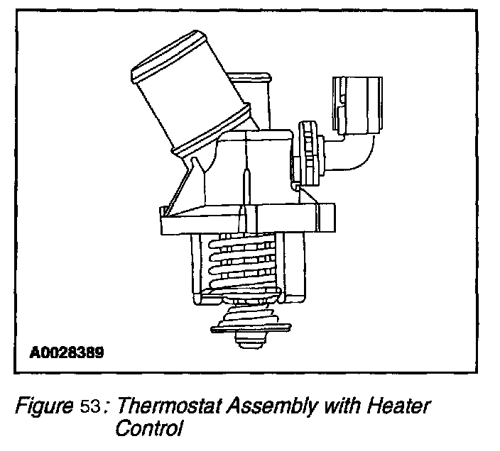 The primary objective for the thermostat heater control is for improvement in fuel economy and thermal efficiency. The system consists of a high temperature (98°C/208°F in lieu of a 90°C/194°F) thermostat (Figure 53) that has a resistive heater within the wax element. The heater is controlled by the PCM dependent on engine speed, throttle position, engine load, barometric pressure, air charge temperature, transmission oil temperature and engine coolant temperature.