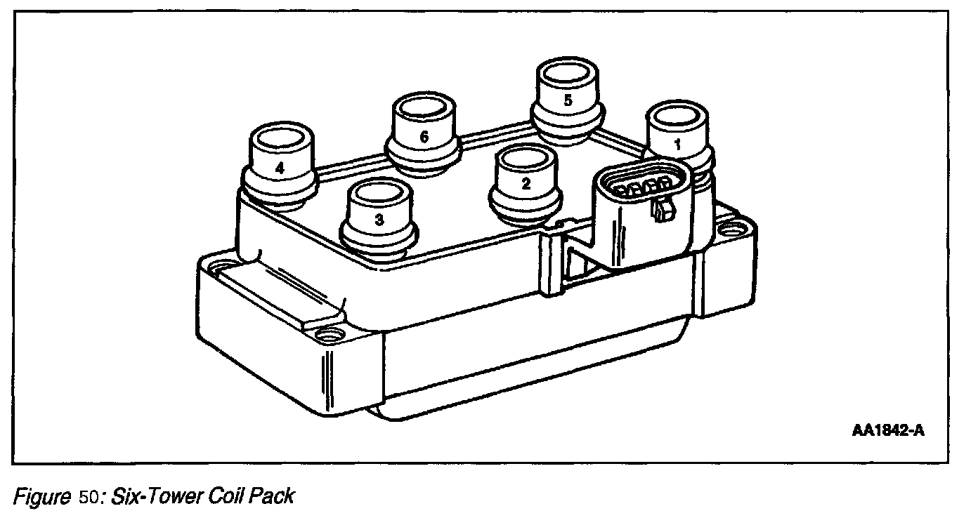 A coil in a coil pack (Figure 50) is turned on (for example is coil charging) by the Powertrain Control Module (PCM), and is turned off when firing two spark plugs at once. The spark plugs are paired so that as one spark plug fires on the compression stroke, the other spark plug fires on the exhaust stroke. The next time the coil is fired the order is reversed. The next pair of spark plugs fire according to the engine firing order.