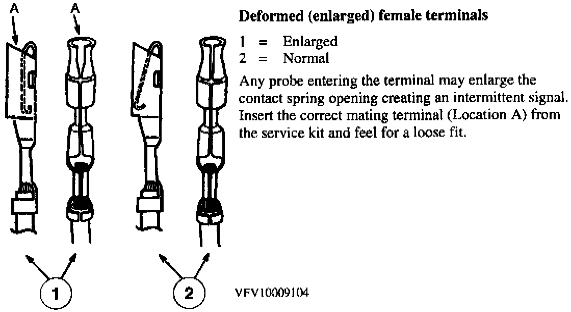 Any probe entering the terminal may enlarge the contact spring opening creating an intermittent signal. Insert the correct mating terminal (Location A) from the service kit and feel for a loose fit.