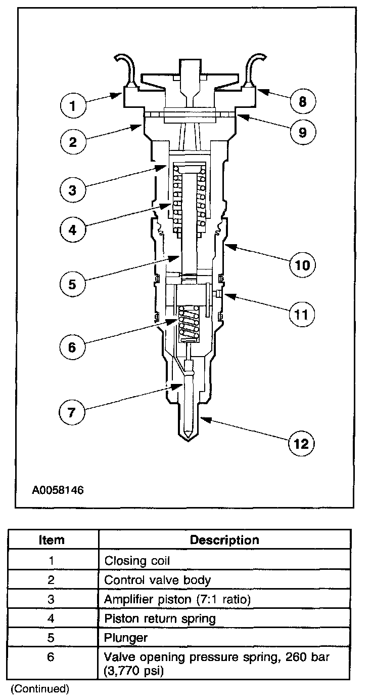 The Electro-Hydraulic Injector Fuel Plunger is located in the injector and is driven by the amplifier piston. The fuel plunger injects fuel into the combustion chamber at pressures of up to 196,500 kPa (28,500 psi) through the nozzle assembly. Fuel is supplied to the injector at approximately 345 kPa (50 psi) through fuel rails in the cylinder heads.