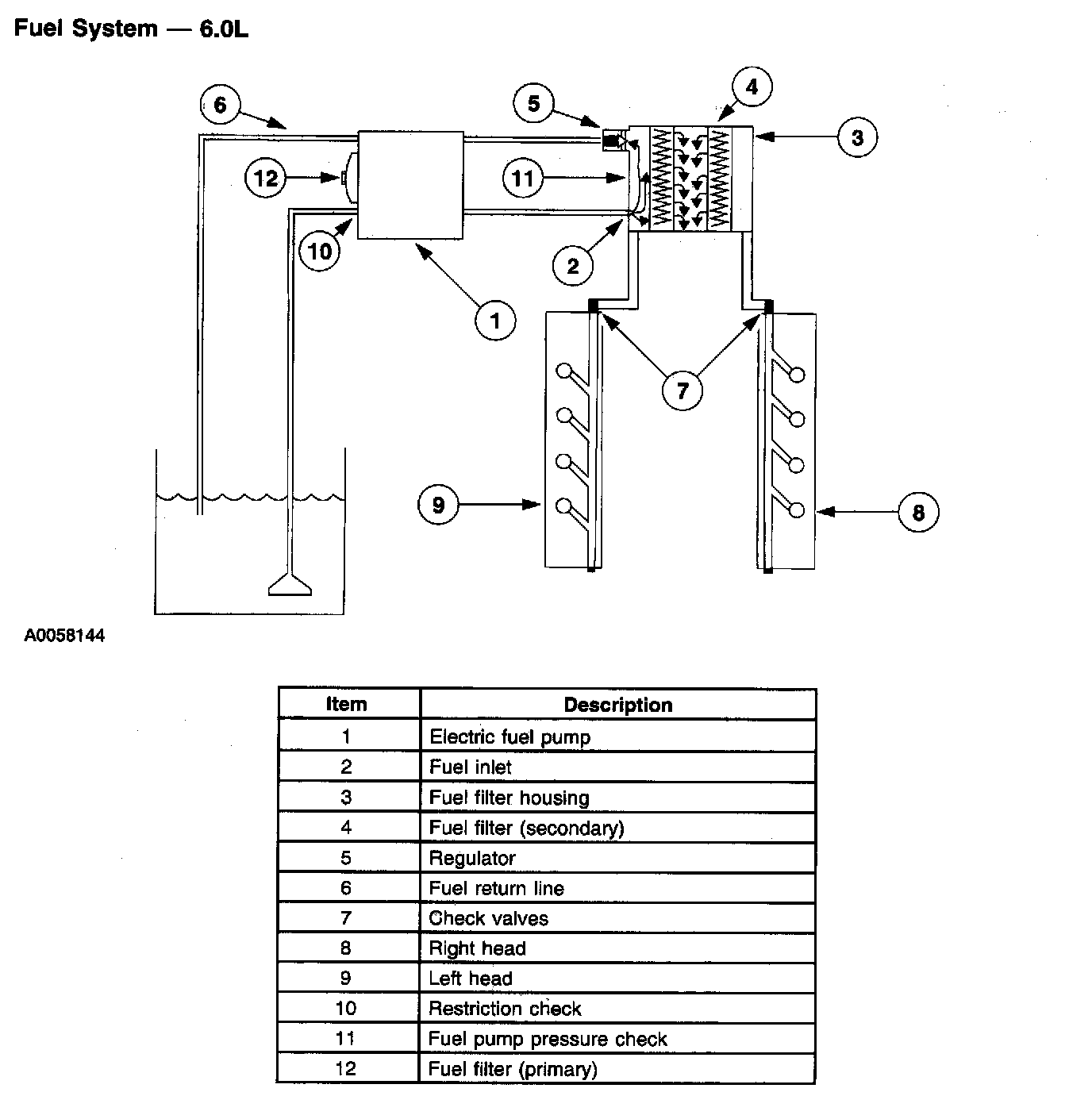 Fuel is drawn from the fuel tank through the primary filter (located in the horizontal fuel conditioning module) by the electric fuel pump. Pressurized fuel, approximately 310-379 kPa (45-55 psi), is supplied to the secondary filter (the fuel filter housing located on the front left side of the engine) by means of the electric pump and regulator valve. The regulator relieves the pressure, sending fuel back to the fuel tank. Only the filtered fuel going through the fuel filter will go to the heads. A check valve is located on both heads to prevent fuel pressure spikes in the fuel rail.