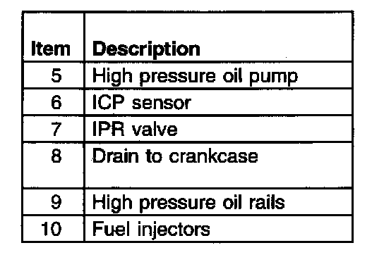 The 6.0L Powerstroke diesel injectors are powered by lubricating oil which is pressurized by a swashplate pump (Rexroth pump) in the engine valley. The pump output pressure ranges from 3,102 to 20,685 kPa (450 psi to 4,000 psi). Oil pressure is controlled by the Powertrain Control Module (PCM) through the Injector Pressure Regulator Valve. The PCM controls pressure in the oil rail by opening (relieving pressure) and closing (increasing pressure) the IPR valve. The high pressure oil is delivered to oil rails in the cylinder heads. An Injection Control Pressure sensor mounted on the high pressure pump cover sends an analog voltage signal (0.5V to 5.0V) to the PCM for feedback control of the oil pressure.