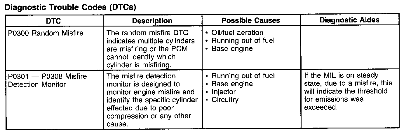 The DTCs associated with cylinder misfire are P0301, P0302, P0303, P0304, P0305, P0306, P0307 and P0308.