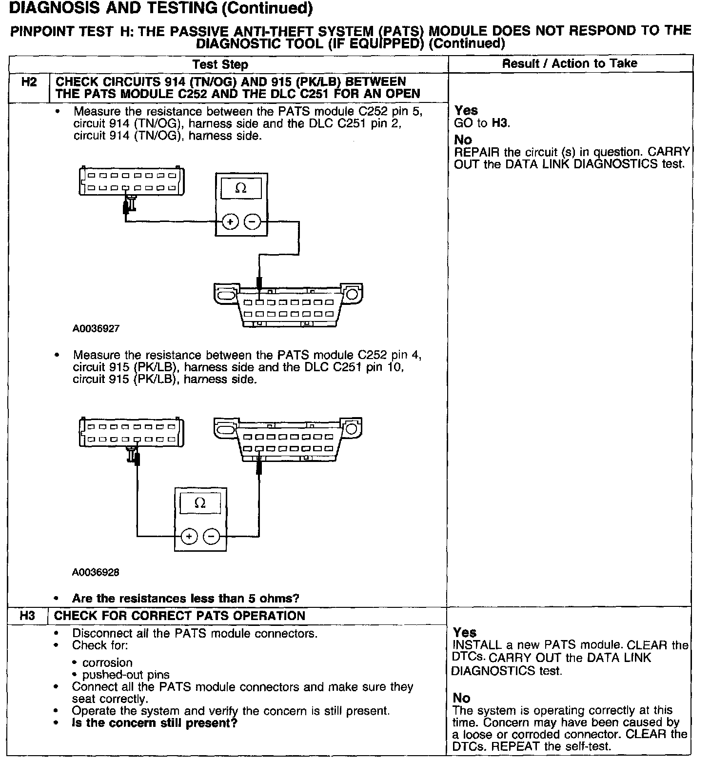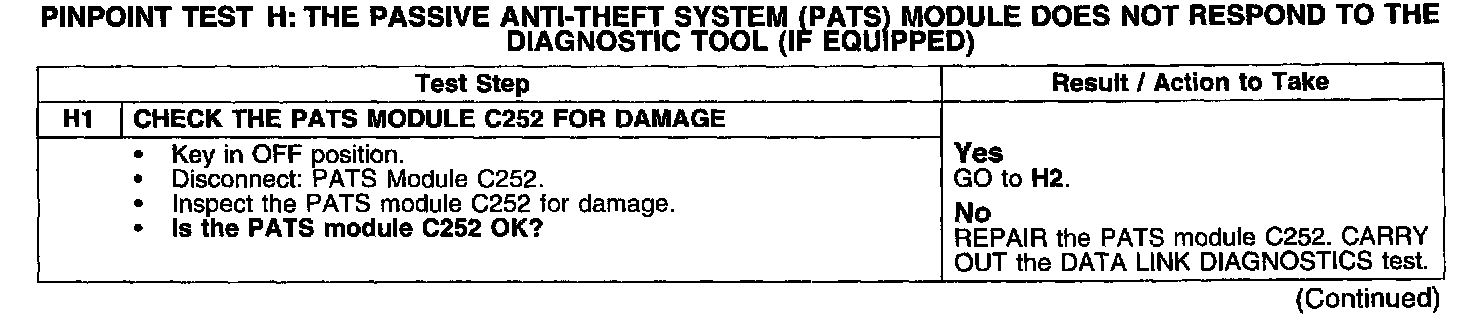 PINPOINT TEST H: THE PASSIVE ANTI-THEFT SYSTEM PATS MODULE DOES NOT RESPOND TO THE DIAGNOSTIC TOOL (IF EQUIPPED)