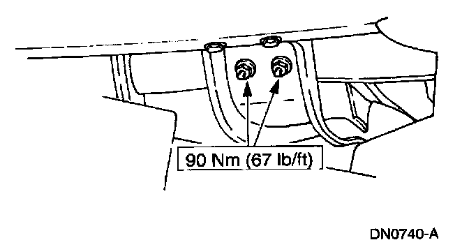 7. Tighten the transmission support crossmember nuts and bolts (RH side) to specification.