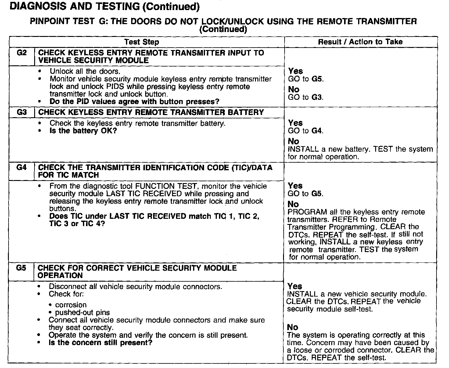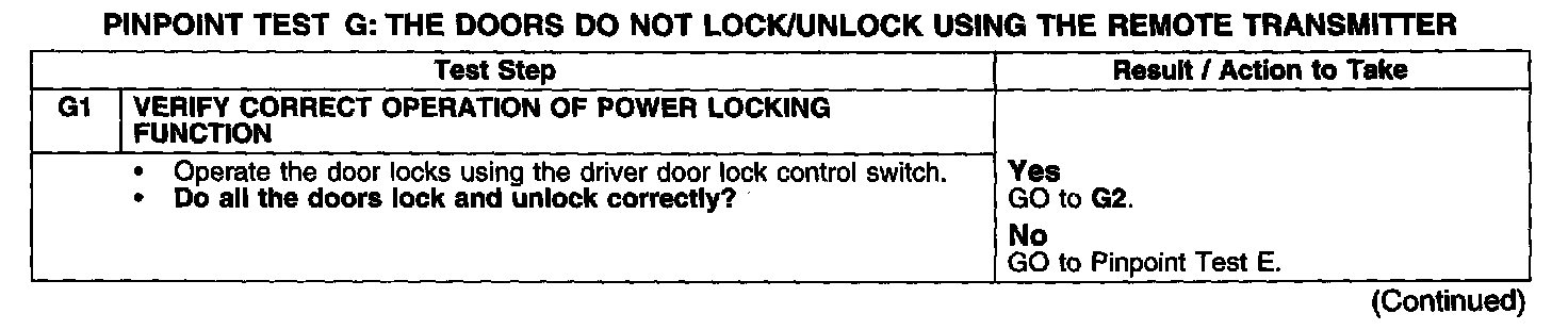 PINPOINT TEST G: THE DOORS DO NOT LOCK/UNLOCK USING THE REMOTE TRANSMITTER