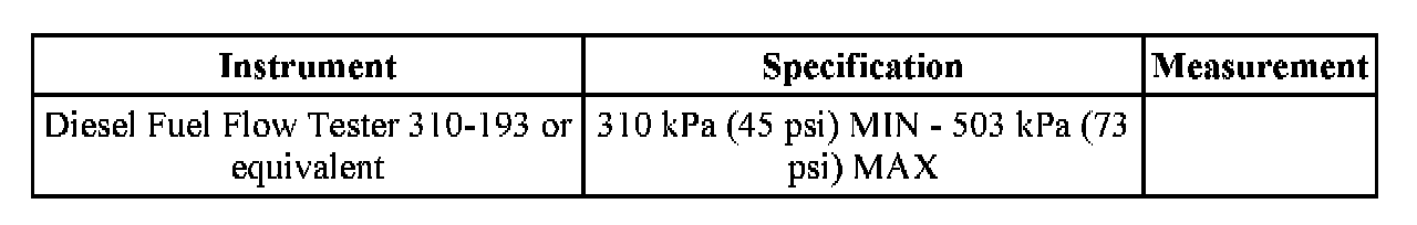 Note: The Diesel Fuel Flow Tester 310-193 or equivalent provides a pressure reading while simulating maximum fuel consumption at full load on the fuel system. The Diesel Fuel Flow Tester 310-193 uses a 1.193 mm (0.047 in) calibrated orifice integrated in the tool assembly to simulate the fuel consumption.