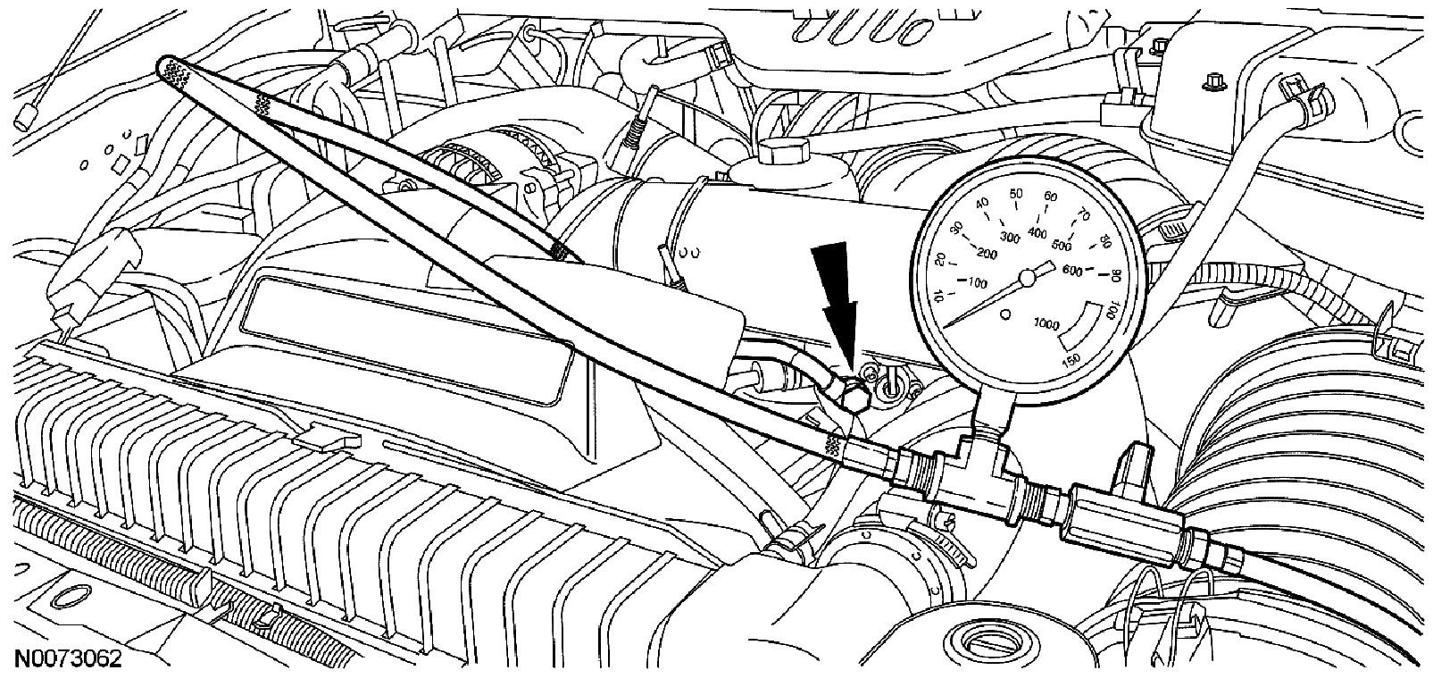 ^ Record the indicated fuel pressure while the valve is open and fuel is flowing back to the fuel tank.