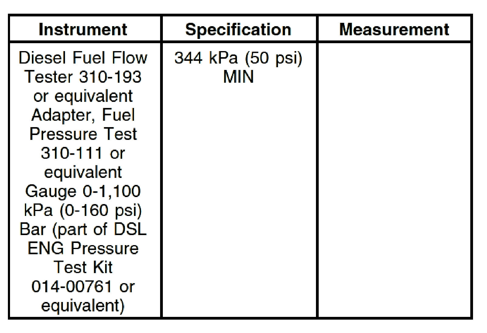 ^ Install the Fuel Pump Adapter 310-111 or equivalent with the Gauge 0-1100 kpa (0-160 psi) Bar (part of DSL ENG Pressure Test Kit 014-00761 or equivalent) between the fuel conditioning module outlet port and the fuel supply line leading to the secondary fuel filter.