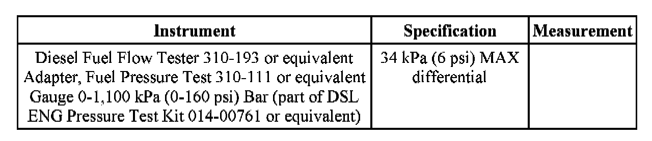 ^ Record the maximum fuel pressure at the fuel conditioning module outlet while the valve on the Diesel Fuel Flow Tester 310-193 or equivalent is open and fuel is flowing back to the fuel tank.