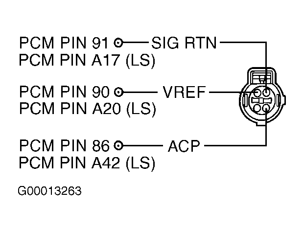 Turn ignition switch to OFF position. Disconnect ACP sensor connector. Turn ignition switch to ON position. Using a DVOM, measure voltage between SIG RTN and VREF circuits at ACP sensor harness connector. See Figure. If voltage is 4-6 volts, go to next step. If voltage is not 4-6 volts, VREF is out of range. Turn ignition switch to OFF position and go to TEST C, step 1). - 12) Induce Opposite ACP Signal