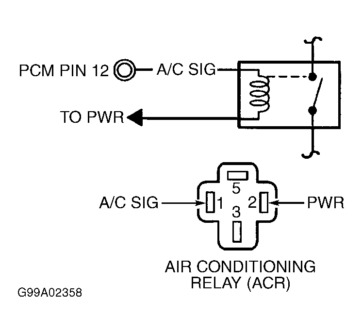 Turn ignition off. Install A/C relay. Disconnect PCM harness connector. Inspect connector for damaged pins and repair if necessary. Turn ignition on. Connect a jumper wire between chassis ground and A/C SIG circuit at PCM harness connector terminal No. 12. See Figure. If A/C relay does not click, go to next step. If A/C relay clicks when A/C SIG circuit is grounded, replace PCM.
