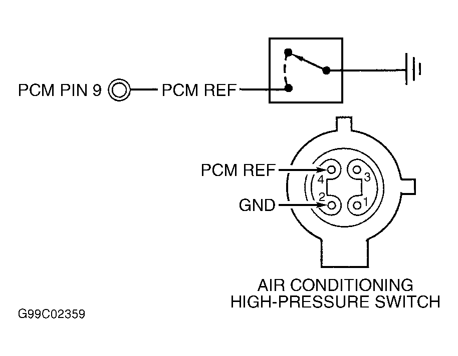 Using DVOM, measure resistance of PCM REF circuit (Blue/Black wire) between PCM harness connector terminal No. 9 and A/C high pressure switch harness connector terminal No. 4. See Figure and Figure . If resistance is less than 5 ohms, go to next step. If resistance is 5 ohms or more, repair open in PCM REF circuit.