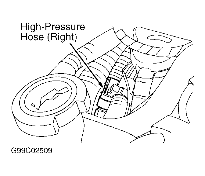- Perform TEST 9C: MONITOR ICP PID WHILE CRANKING (if not already completed). If PID reading indicates less than 500 psi (3448 kPa), injectors are not being energized because of insufficient pressure. Remove high pressure hose from right cylinder head using Quick Disconnect Tool (303-625). See Fig 1. Using Fuel/Oil/Turbo Protector Cap Set (T94T-9395-AH), install appropriate cap on high pressure hose fitting on cylinder head. Using plug from Oil High Pressure Leakage Test Adapter Set (303-S626), install plug into high pressure hose.