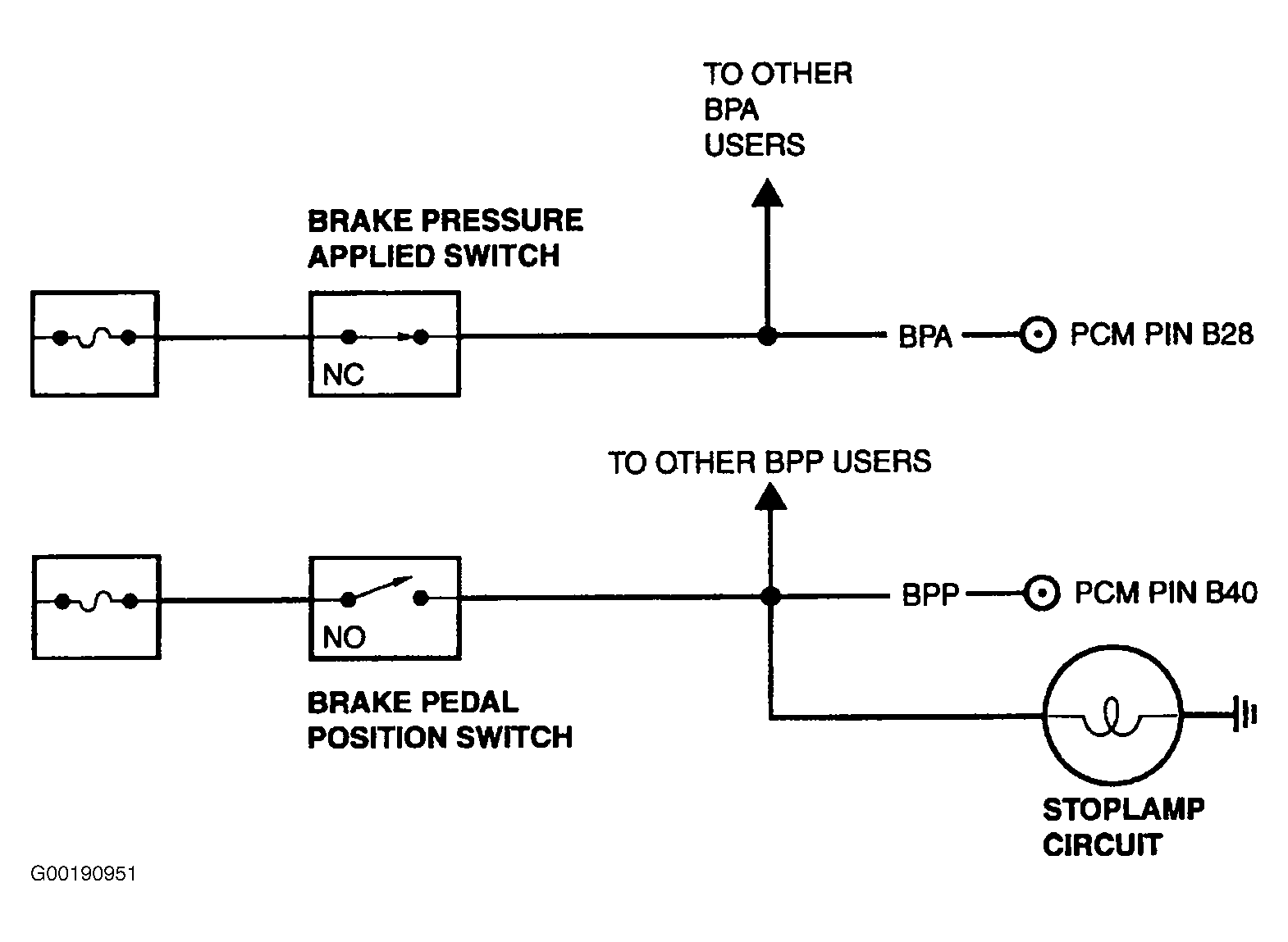 Using a DVOM, measure resistance between appropriate BPP switch terminals. See Figure-Figure . Observe resistance measurement while applying brake pedal. If resistance is 5 ohms or more with brake pedal applied, replace BPP switch. If resistance is less than 5 ohms with brake pedal applied, repair open circuit between BPP switch and brakelight ground. - 7) Verify BPP Switch Is Not Always Closed