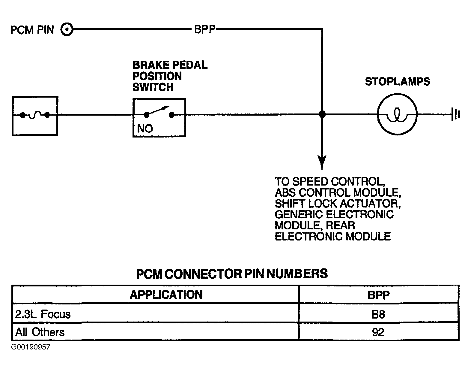 Disconnect BPP switch (located on brake pedal). Turn ignition switch to ON position. If brakelights are still illuminated, go to next step. If brakelights are now off, verify correct installation of BPP switch. If installation is okay, replace BPP switch. - 8) Check For Short To Power In PCM
