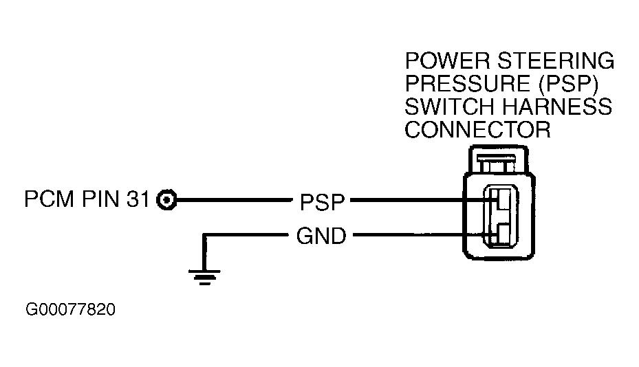 Turn ignition switch to OFF position. Remove shorting bar or disconnect connector from PSP switch. Install a jumper wire between PSP switch harness connector terminals. Start engine and allow to idle. Record PSP PID value. Disconnect jumper wire and again record PSP PID value. If PSP PID value changed from low to high, replace PSP switch. If PSP PID value did not change as specified, go to next step (Focus), or go to step 4) (all others). - 3) Check For Open GND Circuit To PSP Switch