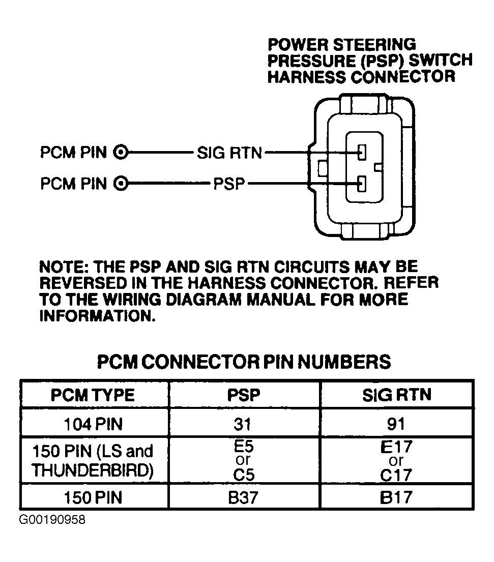 Ensure ignition switch is in OFF position. Disconnect PCM connector(s). On all models, use a DVOM and measure resistance of PSP circuit between PCM harness connector and PSP switch harness connector. On all models except Focus, use a DVOM and measure resistance of SIG RTN circuit between PCM harness connector and PSP switch harness connector. See Figure or Figure . If all resistance measurements are less than 5 ohms, go to next step. If any resistance measurement is 5 ohms or more, repair open in PSP or SIG RTN circuit. - 5) Check PSP Circuit For Short To SIG RTN Or Ground In Harness