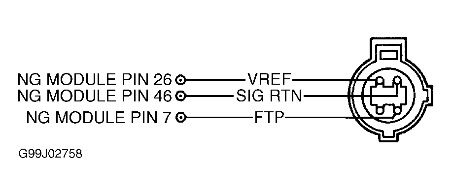 Turn ignition switch to ON position. Using a DVOM, measure voltage between negative battery terminal and VPWR circuit at NG module connector. See Figure. If voltage is 10.5 volts or less, repair open in VPWR circuit between NG module and PCM power relay. If voltage is more than 10.5 volts, repair open in PWR GND circuit. - 54) Check VREF Voltage To Fuel Tank Pressure Sensor