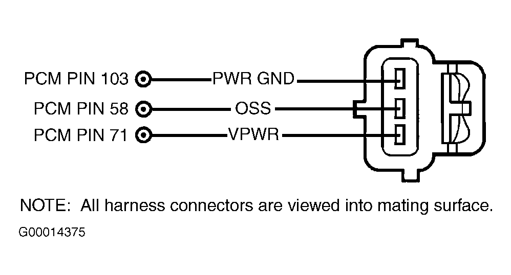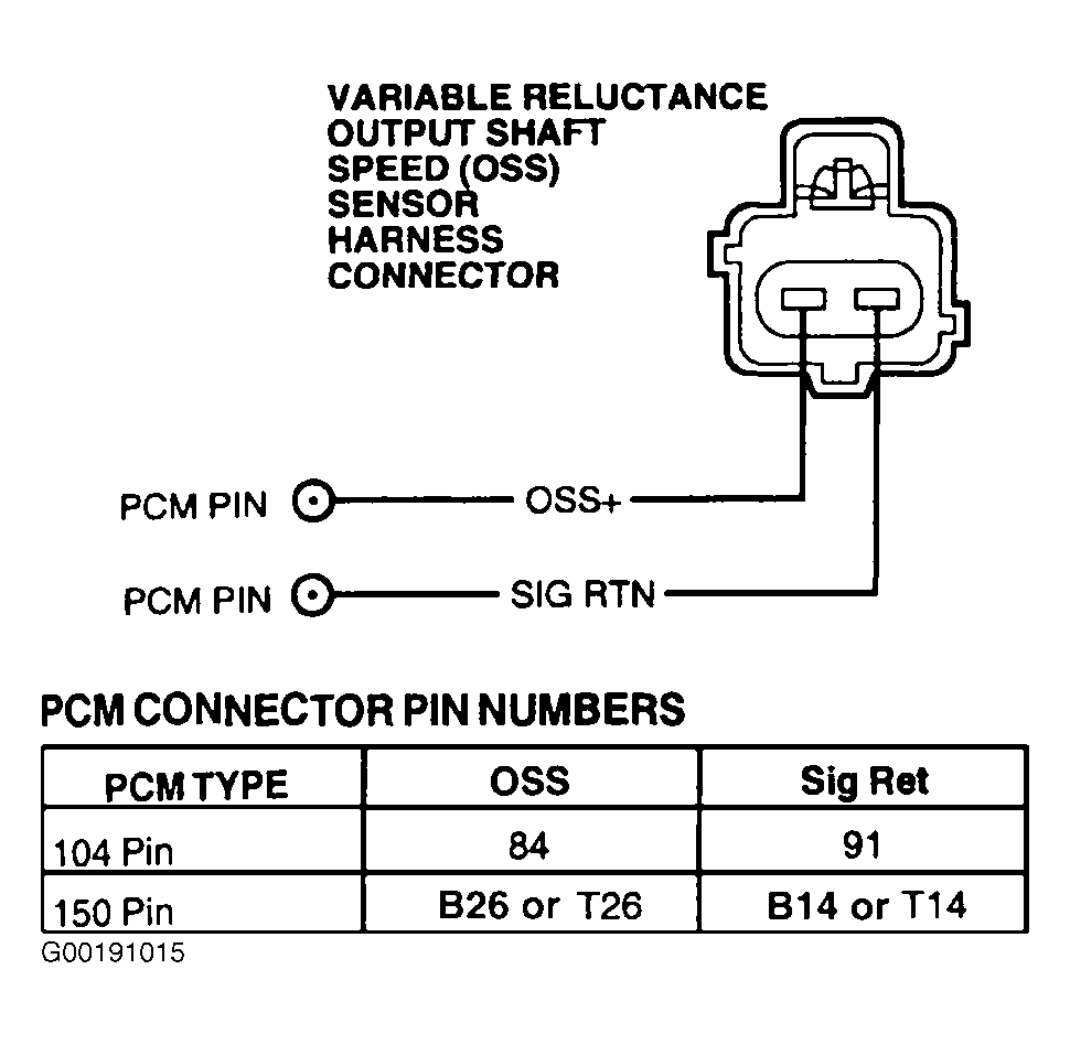 Raise and support front of vehicle so that front wheels can rotate freely. Turn ignition switch to ON position and place gearshift lever in Neutral. Using a DVOM, measure voltage between OSS and PWR GND circuits at PCM harness connector while rotating one wheel with opposite wheel held stationary. See Figure. If OSS sensor output voltage pulses from less than one volt to more than 5 volts, replace PCM. If voltage does not pulse as specified, replace OSS sensor.