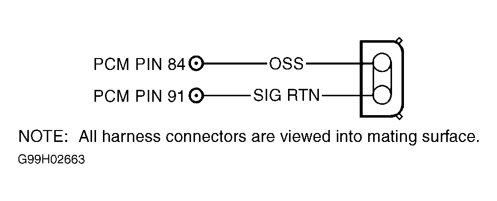 Turn ignition switch to OFF position. Disconnect PCM connector(s). Inspect connector for loose, damaged or corroded terminals. Repair as necessary. Using a DVOM, measure resistance of OSS and SIG RTN circuits between PCM harness connector and OSS sensor harness connector. If both resistance measurements are less than 5 ohms, go to next step. If either resistance measurement is 5 ohms or more, repair open in OSS or SIG RTN circuit. - 7) Check OSS Circuit For Short To SIG RTN Circuit Or Chassis Ground