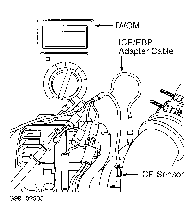 - Remove ICP sensor and install sensor in end of ICP adapter. Connect ICP/EBP Adapter Cable (D94T-50-A) between ICP sensor and sensor wiring harness connector, if available. See Figure. If ICP/EBP adapter cable is not available, go to next step. Connect a DVOM between SIG RTN circuit (Black wire) and ICP signal circuit (Green wire) at ICP/EBP adapter cable. Observe DVOM and crank engine. If engine starts, or voltage reading is 1-4 volts, an injection control pressure oil leak exists in left cylinder head. Go to step 4. If engine does not start, or voltage reading is not 1-4 volts, go to step 5.