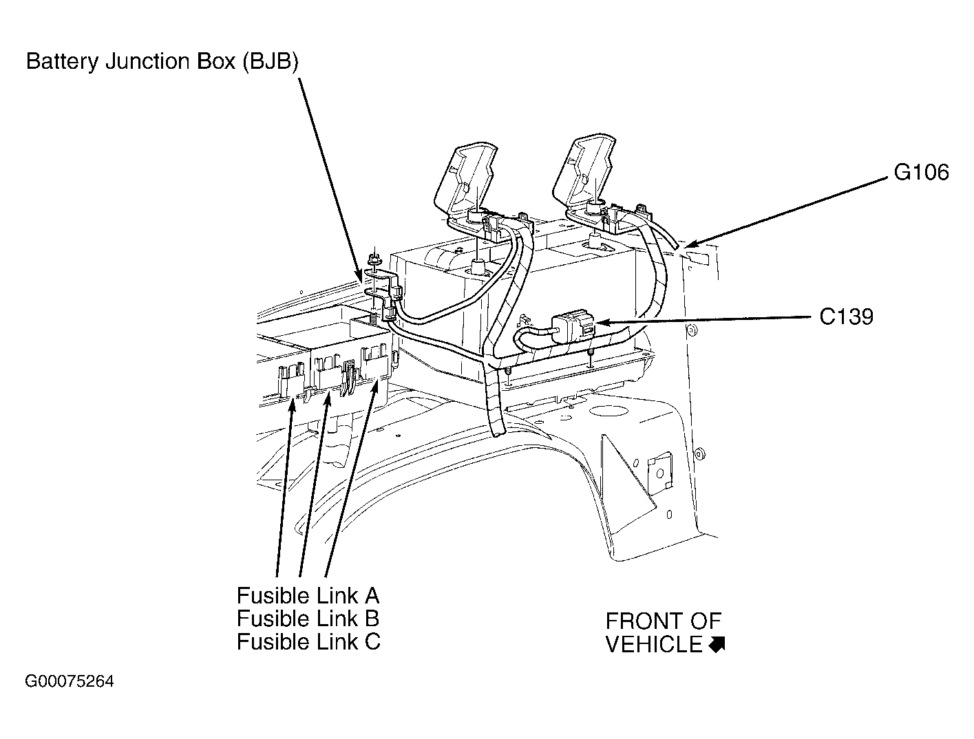 | Battery Junction Box (BJB) | Left side of engine compartment, at fender apron. See Figure. |