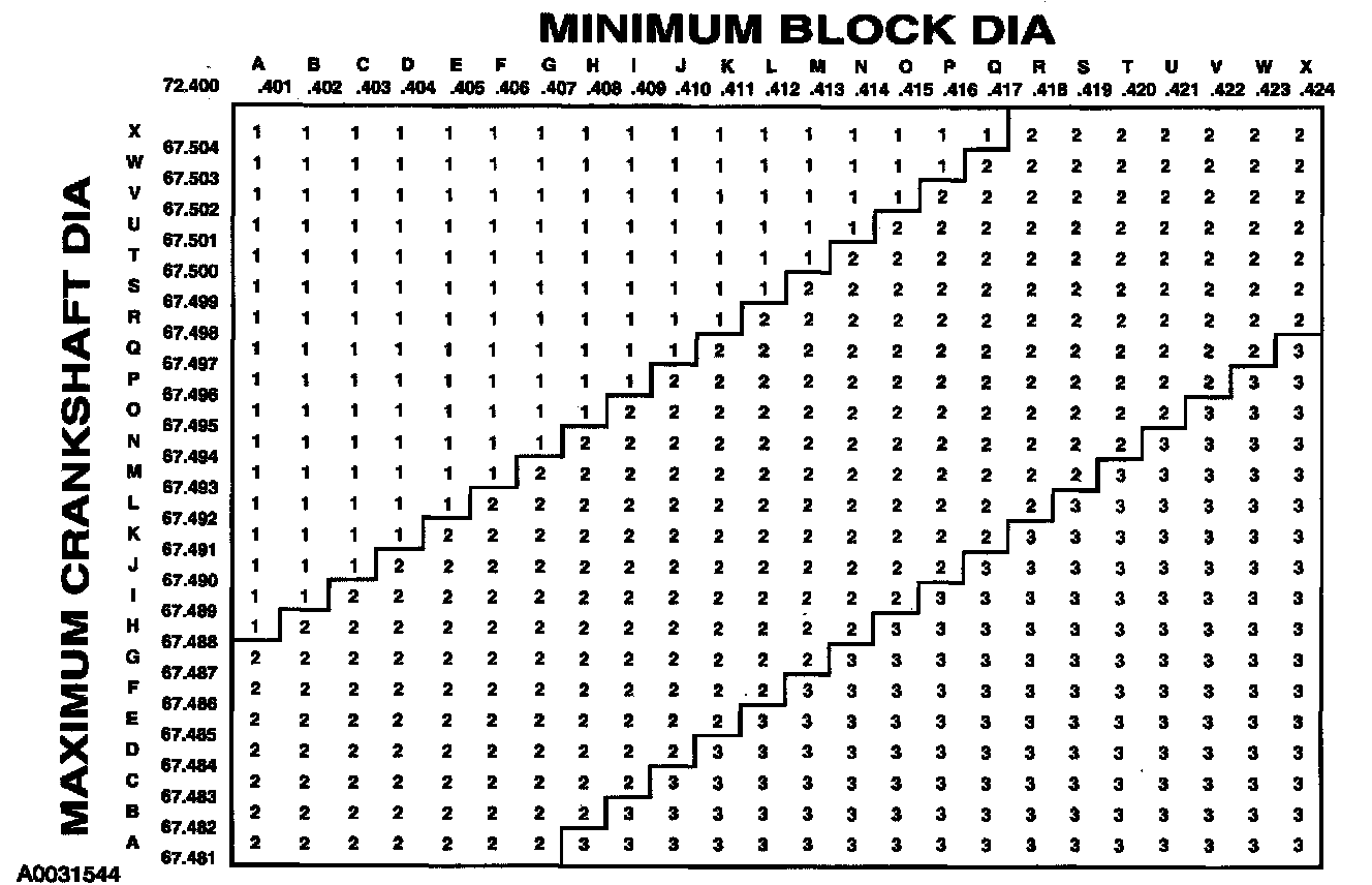 ^ Read the first letter of the engine block main bearing code and the first letter of the crankshaft main bearing code.