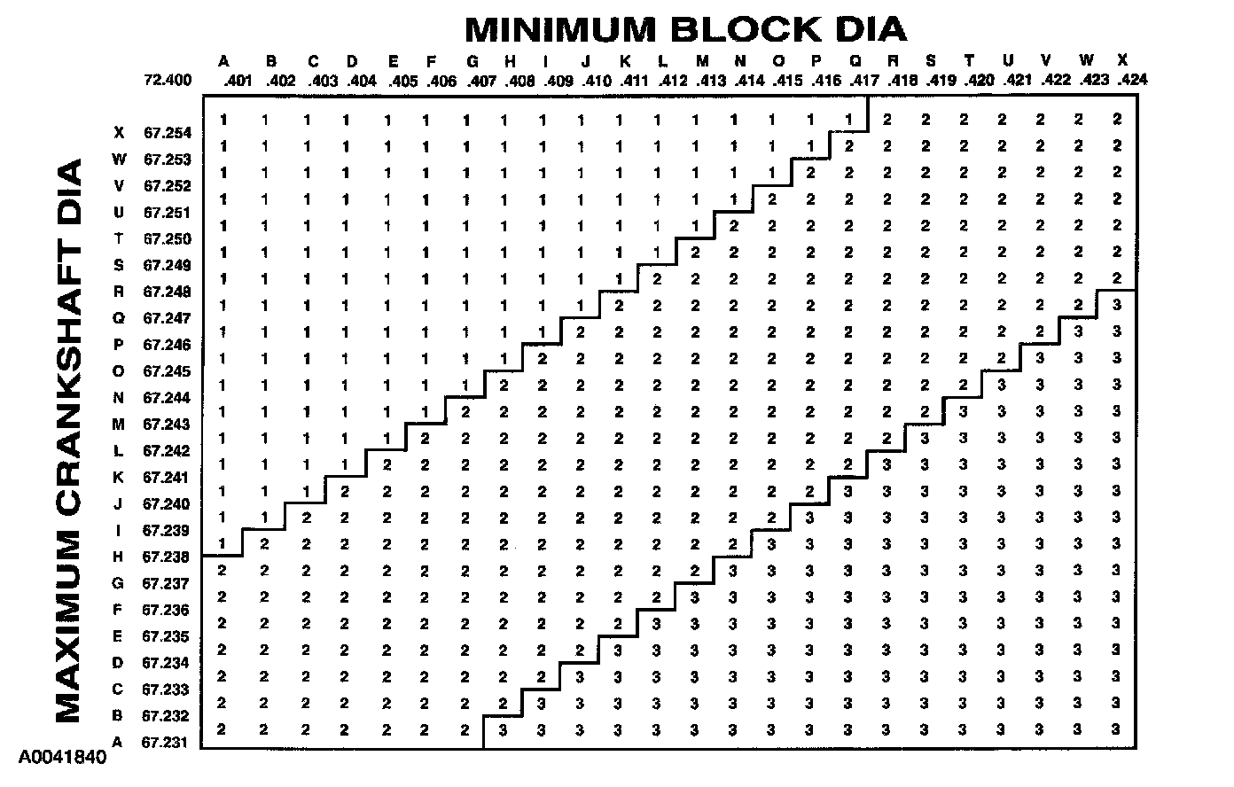 ^ Read down the column below the engine block main bearing code letter, and across the row next to the crankshaft main bearing code letter, until the two intersect. This is the required bearing grade for the number one crankshaft main bearing.