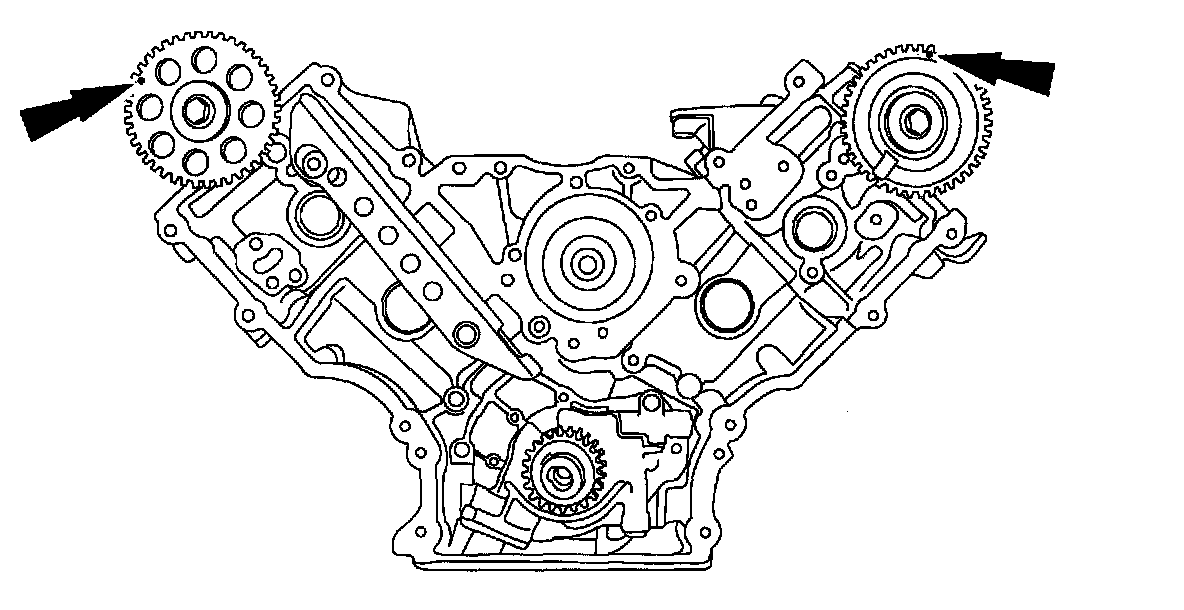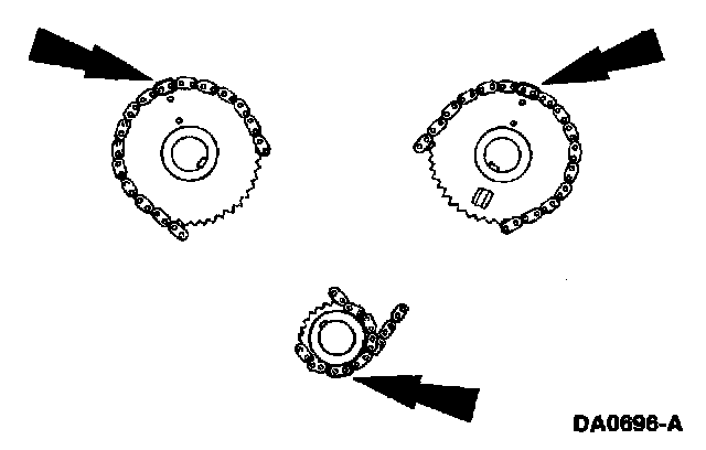 3. Rotate the LH camshaft timing sprocket until the timing mark is approximately at the 12 o'clock position. Rotate the RH camshaft timing sprocket until the timing mark is at approximately the 11 o'clock position.