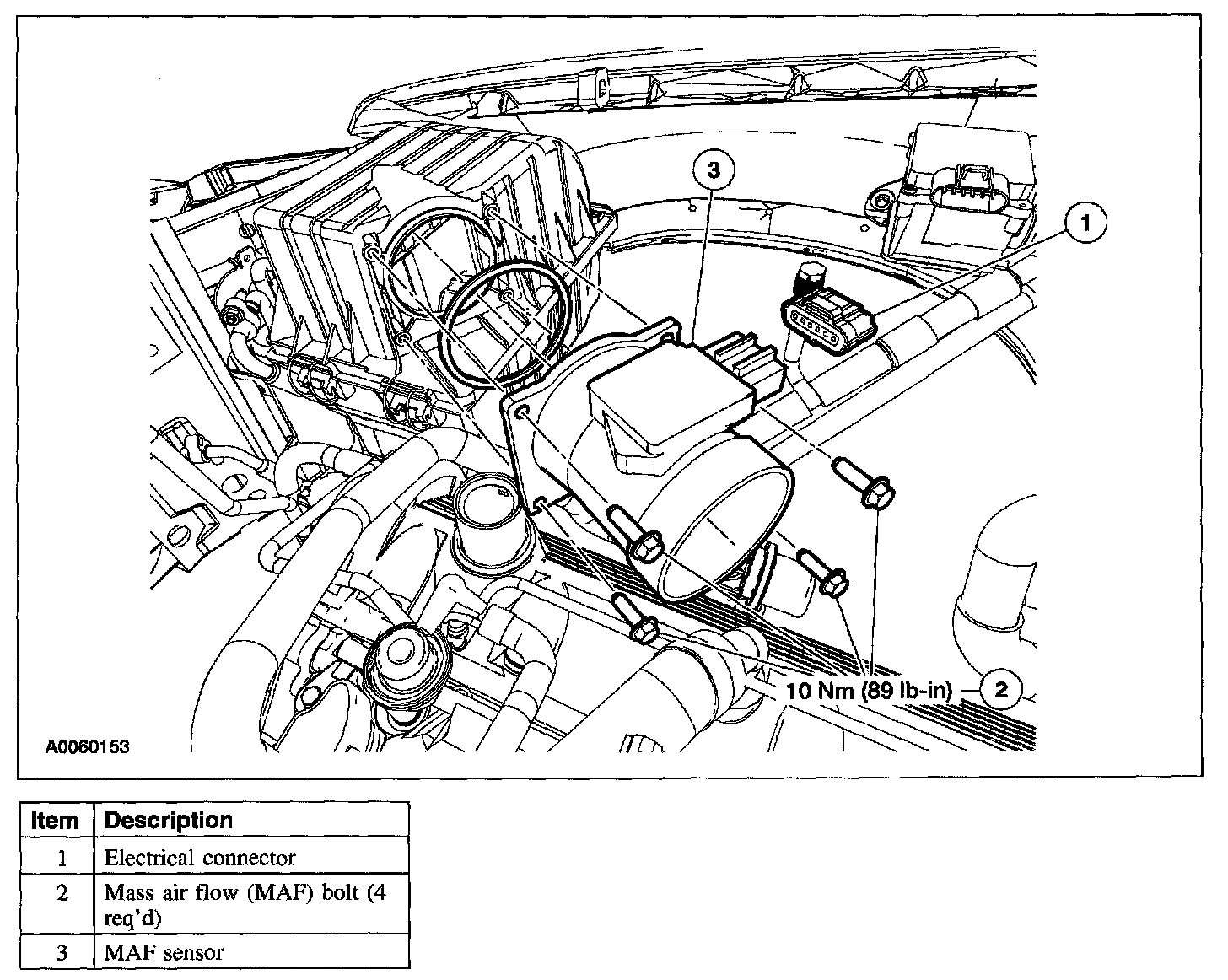 3. CAUTION: The mass air flow (MAF) sensor electronics module and body are calibrated as a unit and must be serviced as a unit. Do not tamper with the sensing elements located in the air flow bypass of the MAF body.