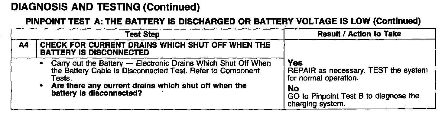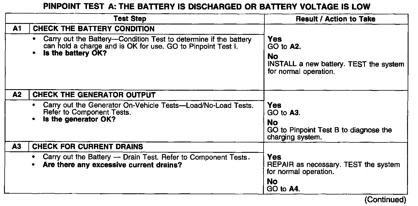 PINPOINT TEST A: THE BATTERY IS DISCHARGED OR BATTERY VOLTAGE IS LOWTest A1-A3: